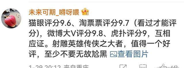 而有网友则反驳“猫眼评分9.6、淘票票评分9.7(看过智力评分),微博大V评分9.8、虎扑评分9,相互应证。射雕好汉传侠之大者,值得一个好评,至少不要无故尬黑 。”