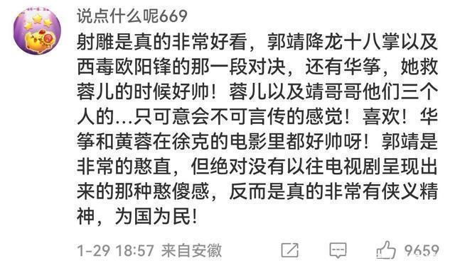 还有不雅众说,“射雕是真是十分颜面,郭靖降龙十八掌以及西毒欧阳锋的那一段对决,还有华筝,她救蓉儿的时候好帅!蓉儿以及靖哥哥他们三个东谈主的…只能流露不行言传的嗅觉!心爱!华筝和黄蓉在徐克的电影里都好帅呀!郭靖口角常的坦荡,但皆备莫得以往电视剧呈现出来的那种憨傻感,反而是真是十分有侠义精神,为国为民!”