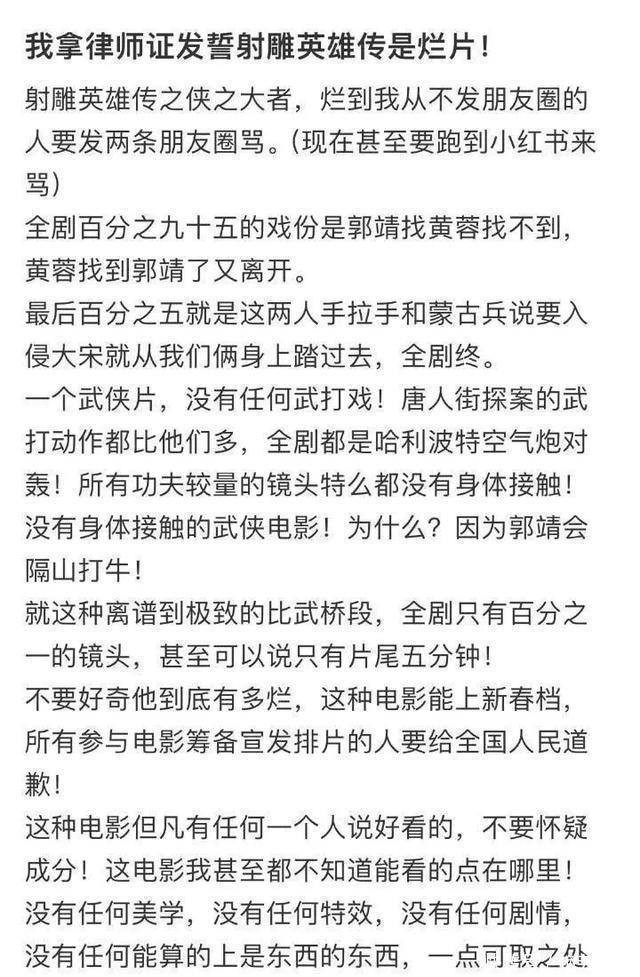对于射雕好汉传,有网友发帖称:“射雕好汉传之侠之大者,烂到我从不发一又友圈的东谈主要发两条一又友圈骂。(当今致使要跑到小红书来骂)