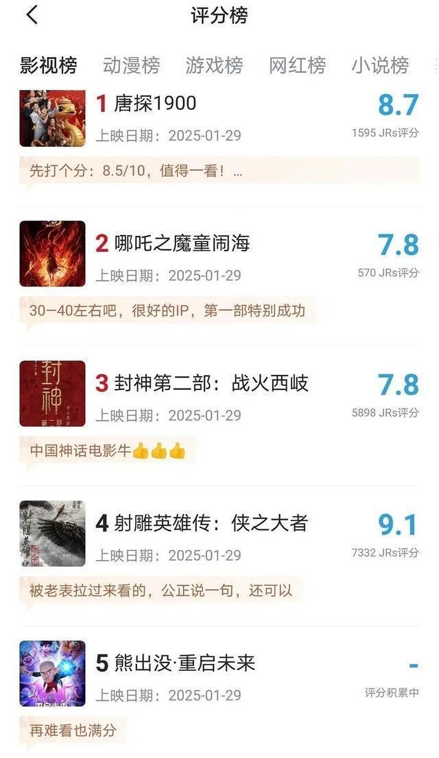 日前,春节档电影虎扑评分出炉,《唐探1900》8.5;《哪吒之魔童闹海》7.8;《封神第二部战火西岐》7.8; 《射雕好汉传侠之大者》9.1;《熊出没.重启改日》9.0;》蛟龙行动》8.0。