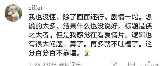 看过电影的网友说,我也没懂。除了画面还行。剧情一坨。念念说的太多。效果什么也没说好。标题是侠之大者。关联词我嗅觉在看爱情片。逻辑也有很大问题。算了。再多就不吐槽了。这分百分百不靠谱。