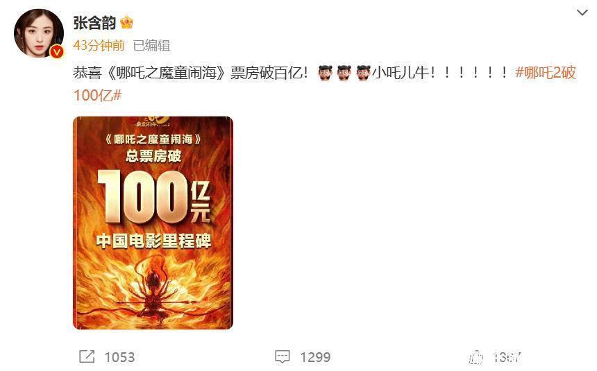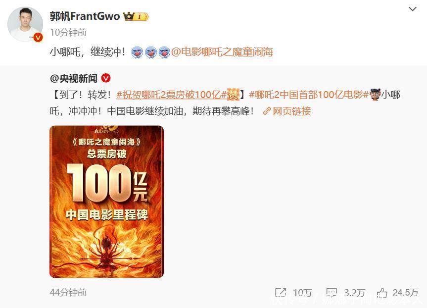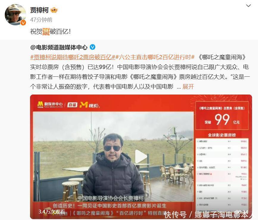 有名电影导演贾樟柯、珍宝等明星也纷纷发文祝颂《哪吒2》票房破百亿。