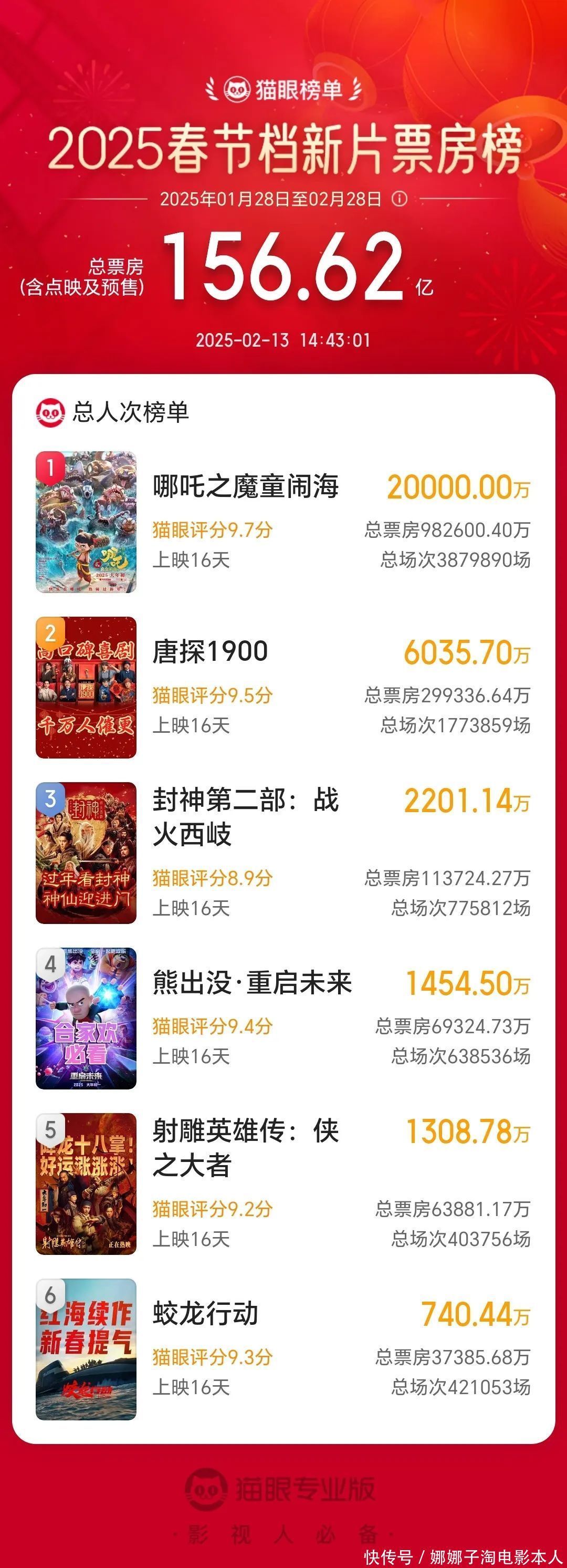 放胆2月13日14时43分,电影《哪吒之魔童闹海》不雅影东谈主次破2亿,成为中国影史首部不雅影东谈主次破2亿电影!