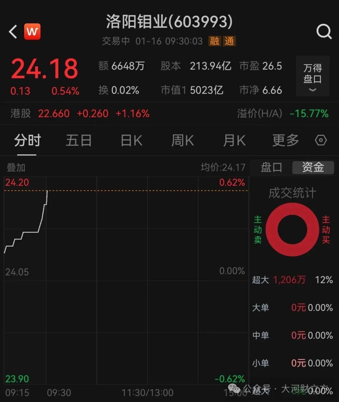 【大河财立方记者徐姣】在有色金属价钱捏续走强、功绩预喜的配景下,1月16日,洛阳钼业股价开盘即拉升开yun体育网,总市值抨击5000亿元大关。