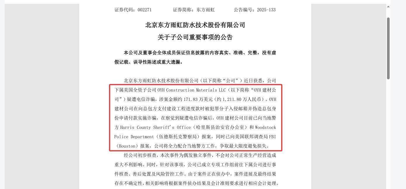 12月23日晚,A股上市公司东方雨虹(002271)公告,该公司下属好意思国全资子公司OYH建材公司近日疑遭电信糊弄,涉案金额约171.83万好意思元(约1211.80万元东说念主民币)。现在,该公司已向好意思国联邦访谒局FBI(Houston)报案,案件正在侦办中。